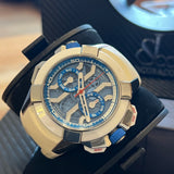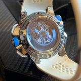 47 mm átmérő. Titán tok. Kerámia és titán lünetta. Kék vázas számlap. Világító mutatók. Zafírüveg. Automata szerkezet. Átlátszó hátlap. Fehér Jacob & Co gumiszíj. Titán összecsukható csat Jacob & Co emblémával.